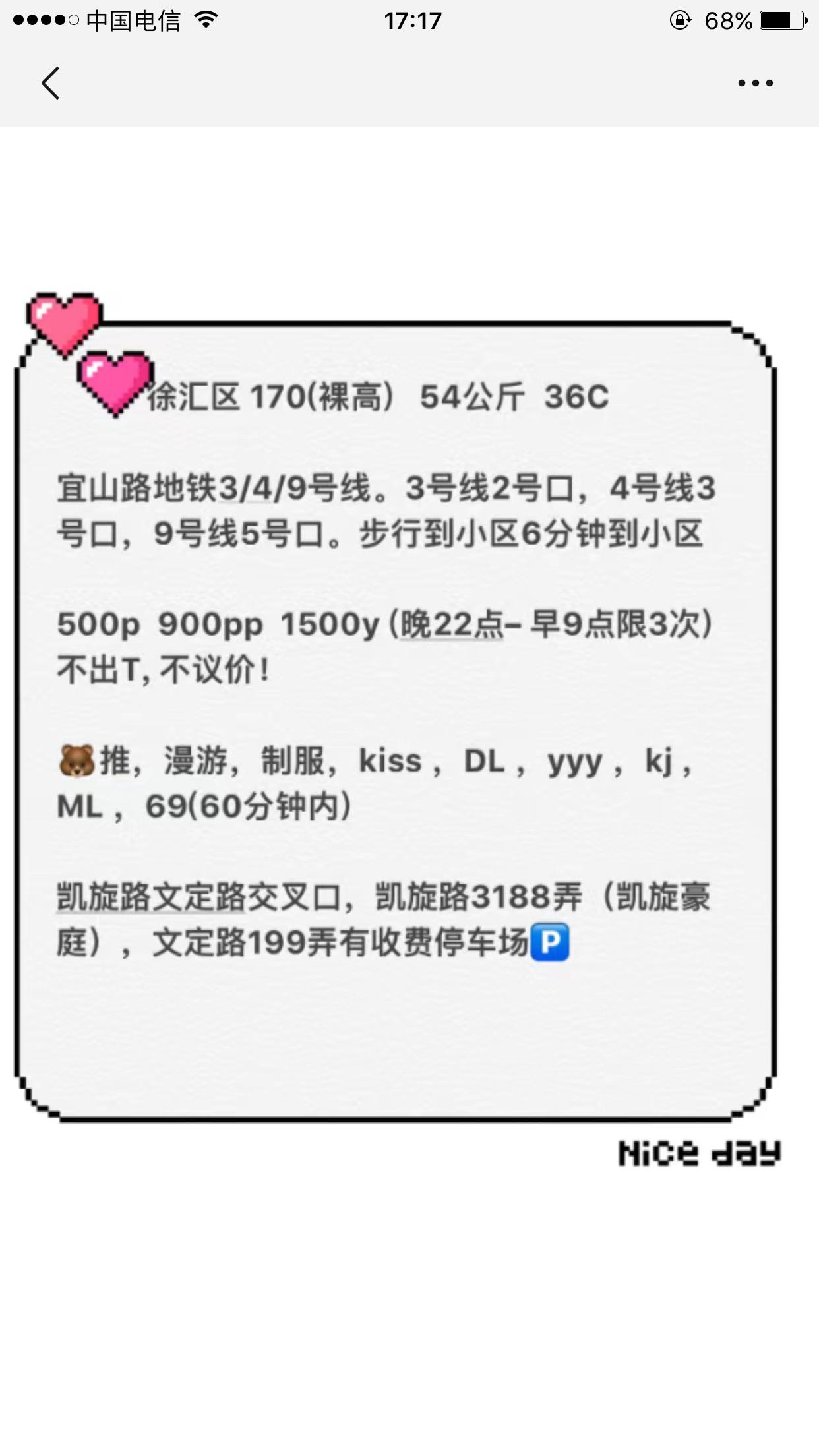 【寻欢时间】:2019年01月19日 【寻欢地点】:上海 【信息来源】:亲身体验 【服务项目】:漫游,制服,口活,爱爱、DL、kiss 【妹妹数量】:1 【环境设备】:优雅 【营业时间】:联系好就行 【价格一览】:500/次或900/PP,BY1500(22:00-9:00) 【安全评估】:评分,满分100。 【服务星级】:★★★★★(最高5星)应适当评价质量 【重点推荐】:最值得推荐的地方以供参考 【联系方式】:[unfree]WX:zb527999[/unfree] 【寻欢细节】:下午去的,妹子一个人住,环境不错。身高挺高的应该有170左右,胸型很好看,摸起来吮吸起来挺爽的。该有的服务都有,有舌吻比较惊喜。做的时候有制服,做了一次觉得不过瘾,妹子后面还有客户。出去溜达一圈回来第二发,感兴趣的朋友可以去试试。 【附带照片】: