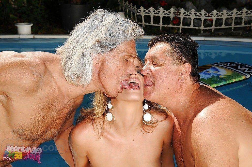 金发成熟少妇户外泳池边被两个老男人双飞【16P】
