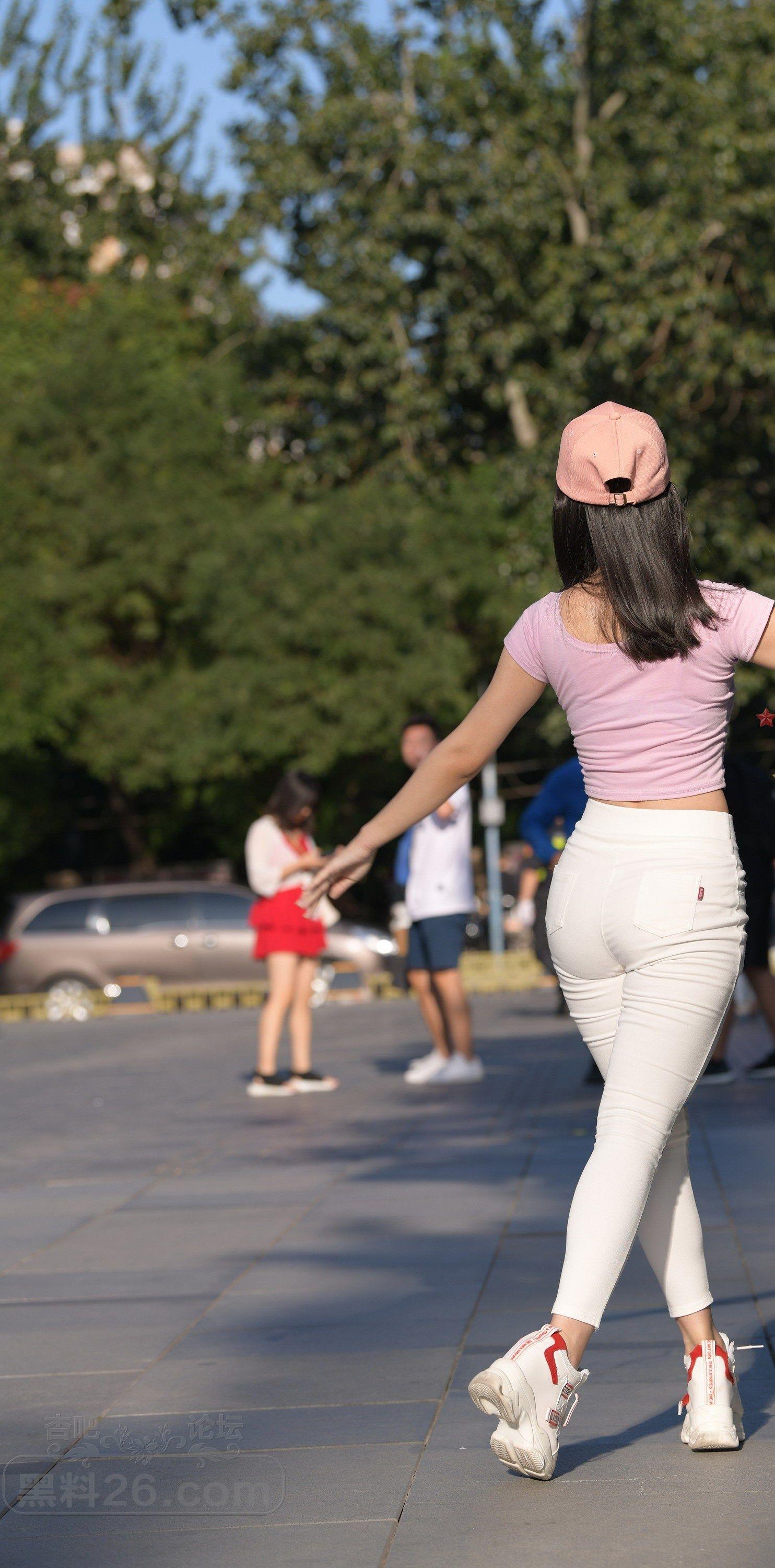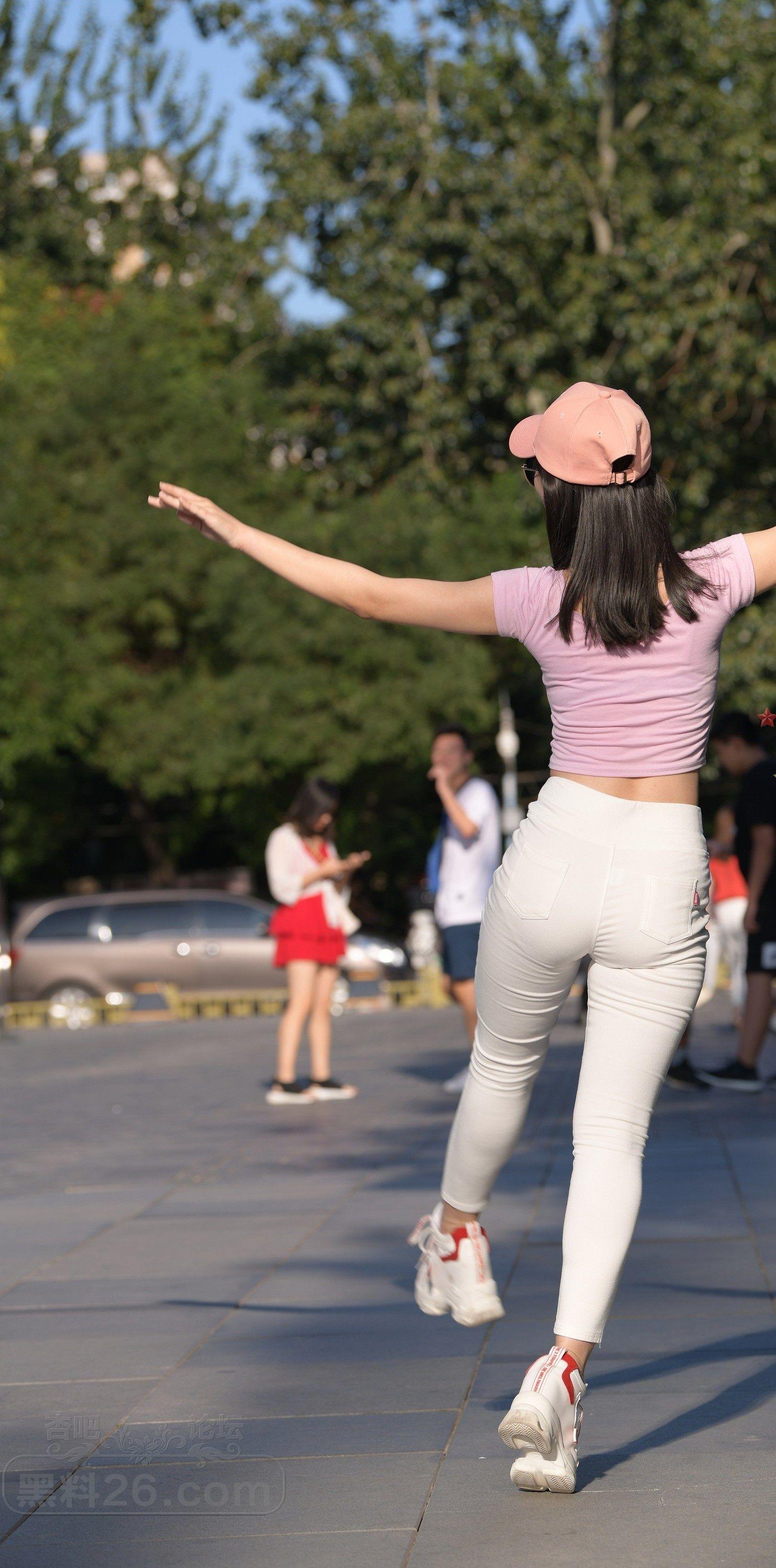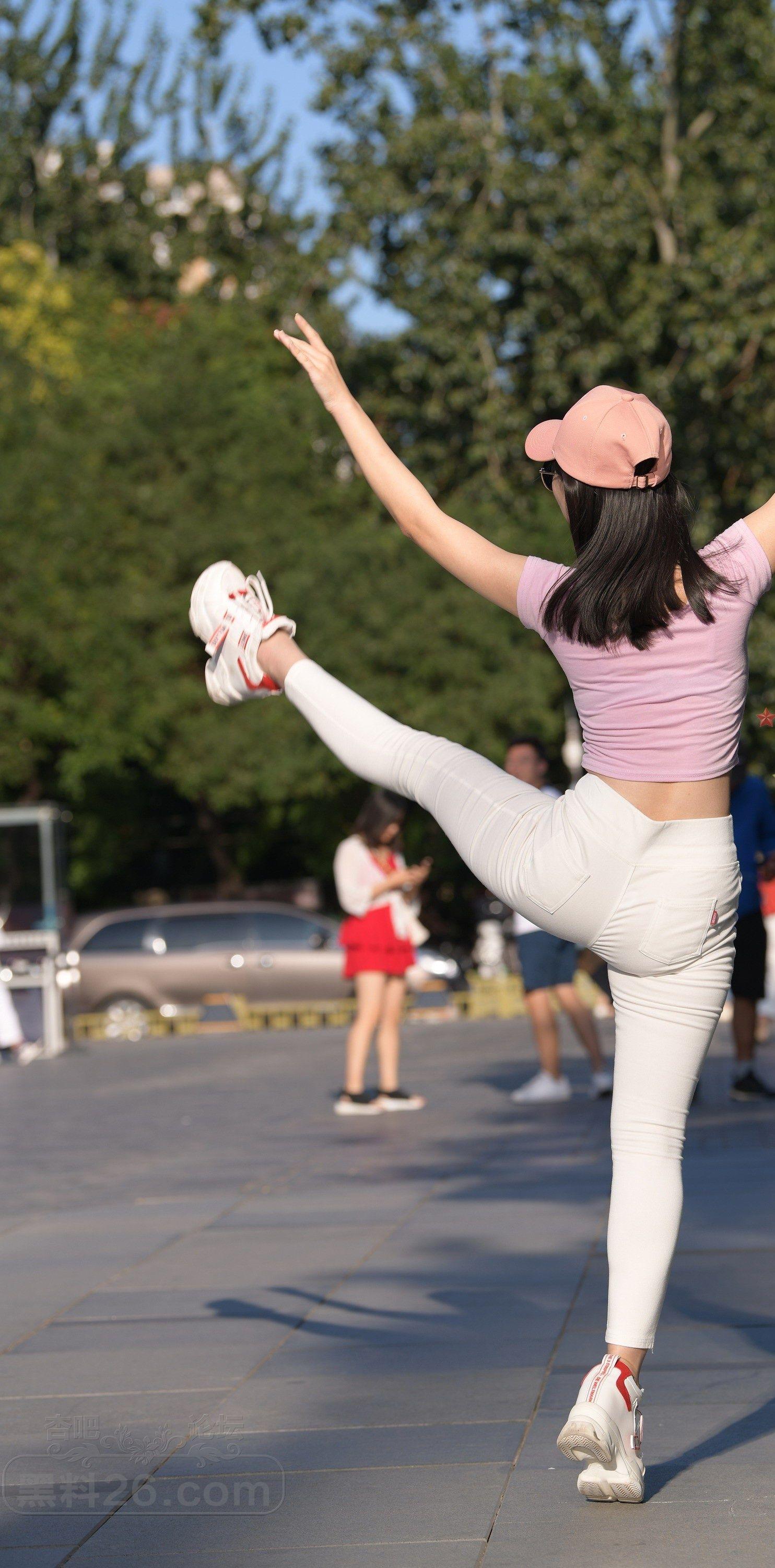 粉色短袖白色紧身裤美女户外广场上练习瑜伽【10P】