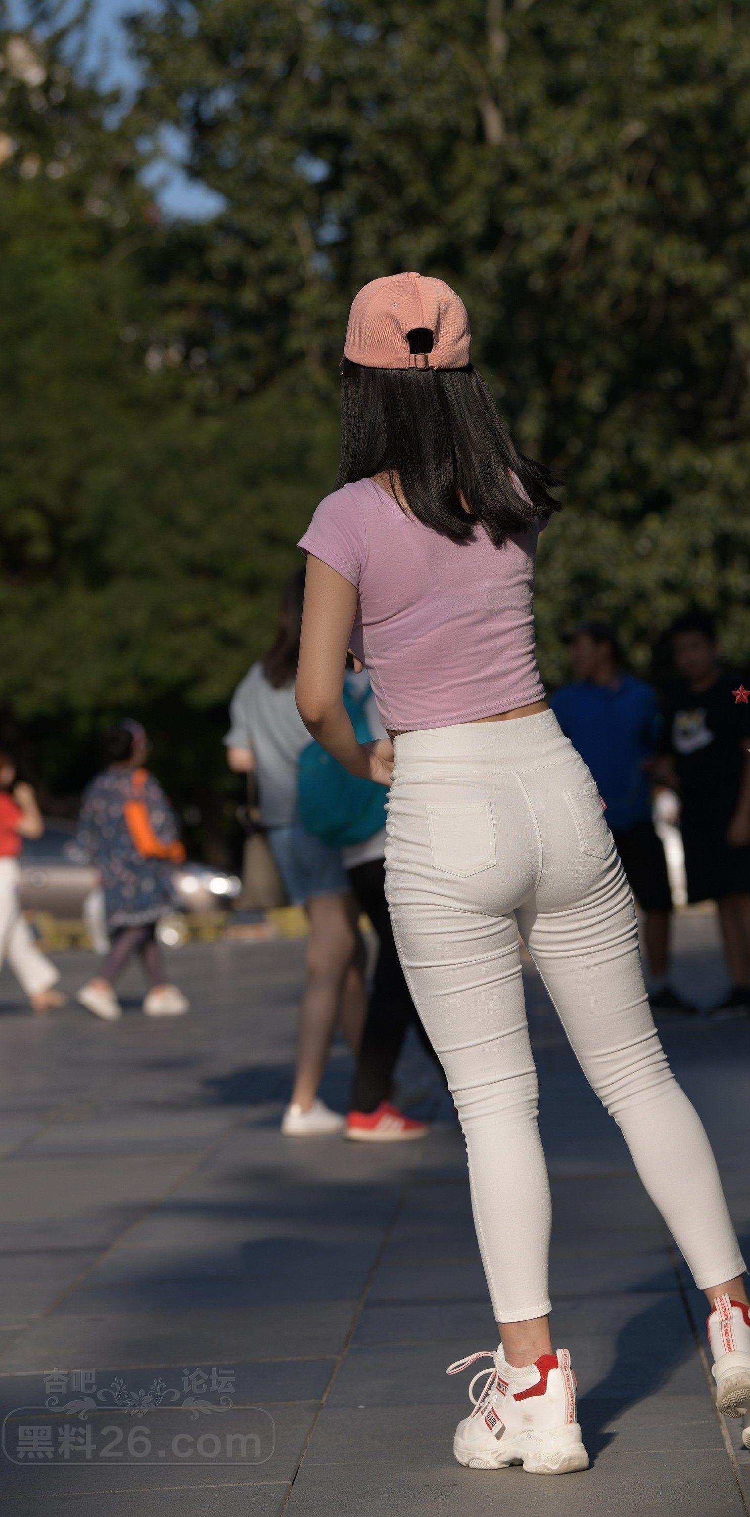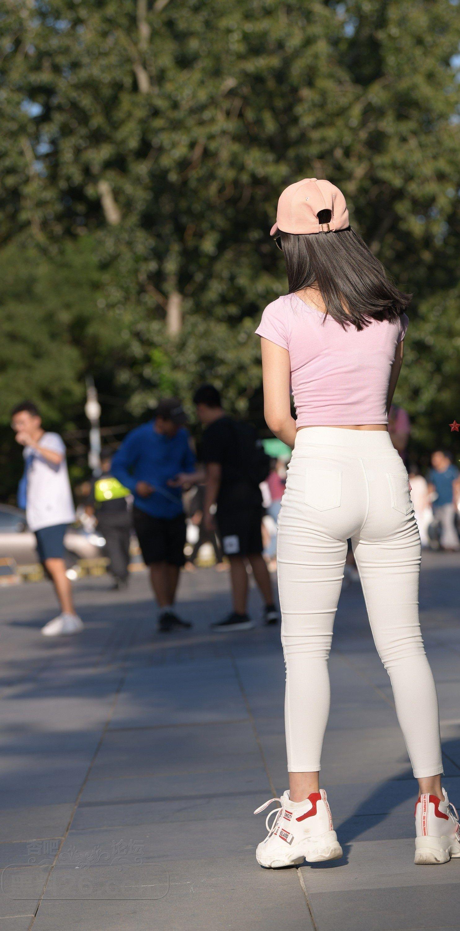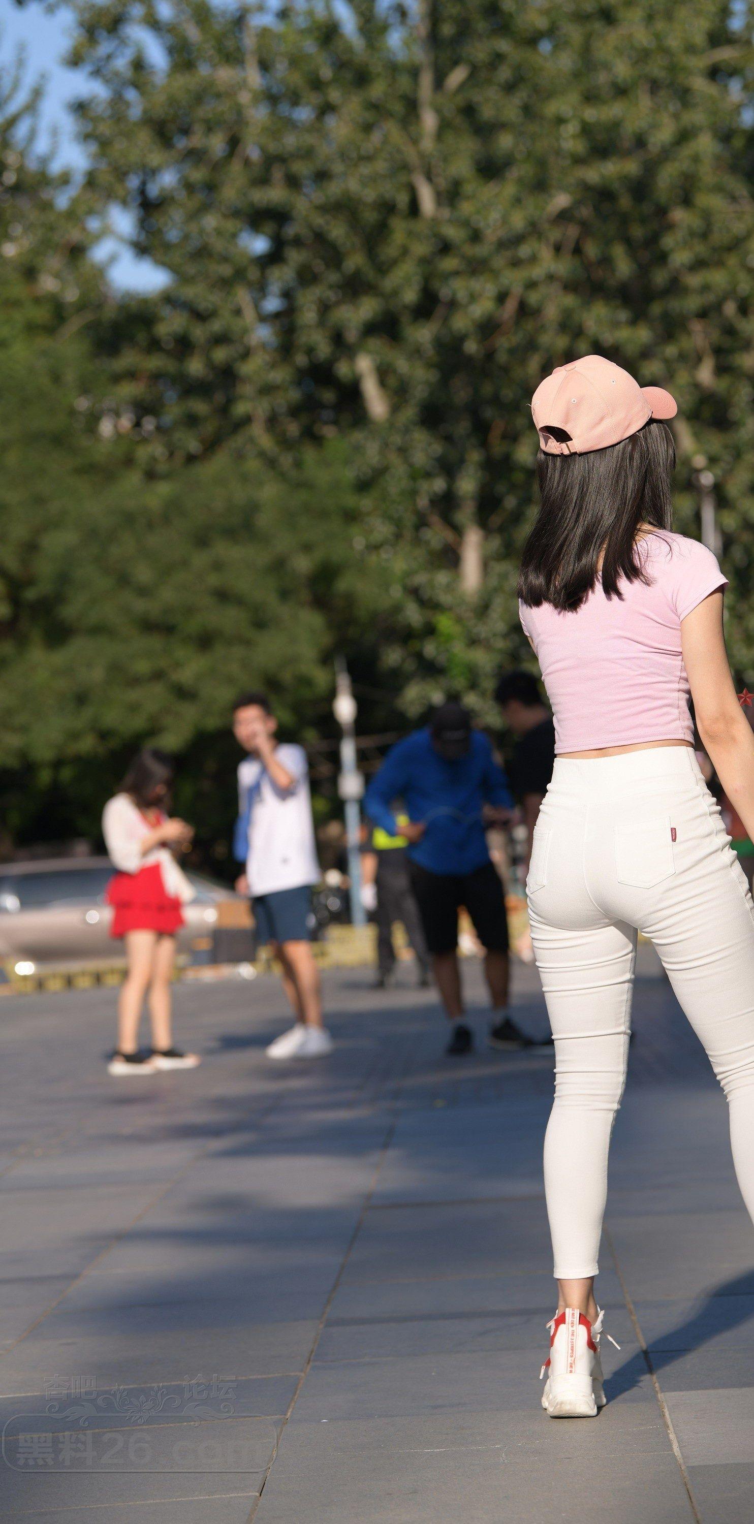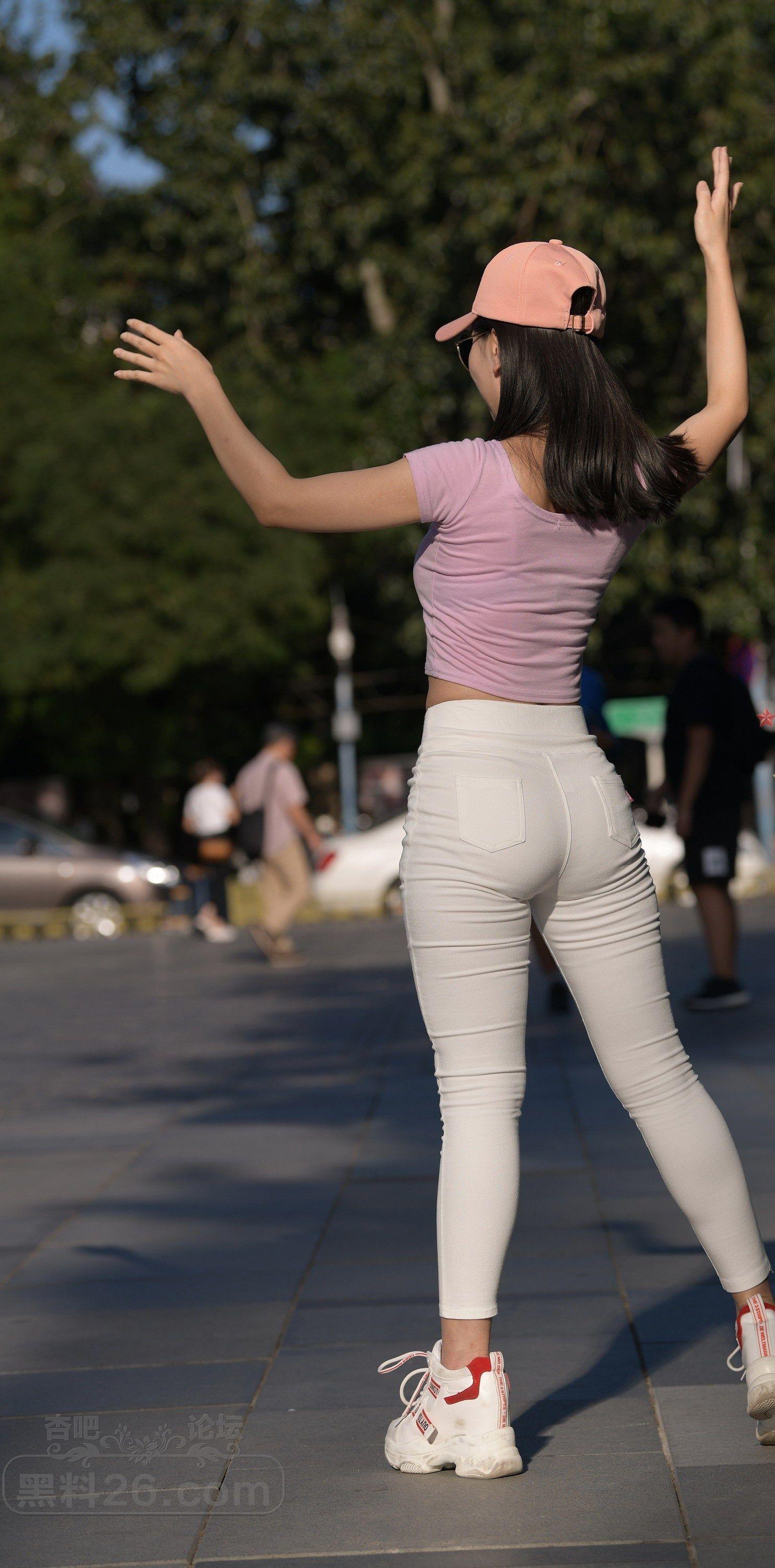粉色短袖白色紧身裤美女户外广场上练习瑜伽【10P】