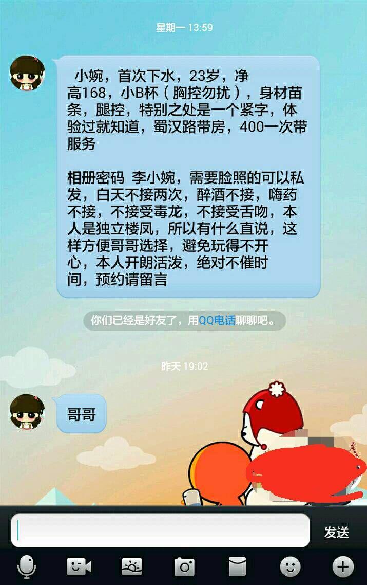 【寻欢地点】:成都市蜀汉路 【信息来源】:QQ群 【服务项目】:口和做爱,各种服务,不接受舌吻、毒龙,其他都可以 【妹妹数量】:1 【环境设备】:干净、舒适 【营业时间】:提前联系 【价格一览】:400带服务 【安全评估】:100(自己租的房子里面) 【服务星级】:★★★★★(最高5星) 【寻欢细节】:春节期间实在无聊的很,加上老婆又怀起孕然后回娘家去了,一个人实在没事干,就通过朋友找到了这个妹妹,挺年轻的,不像有些楼凤或者工作室,照片上是年轻女娃娃去了才发现是老母母。身材挺瘦的,虽然胸没那么大,但是确确实实是真实的瘦子魔鬼身材,整的我都不忍心用力去干。还有个特点就是服务的时候很热情,我还跟她摆了半天悬龙门阵。 【联系方式】: 购买联系方式会员必看: 验证成功后,请及时到 》》【真人验证】《《(点击进入发帖板块)发布验证主题,返还1000--10000彩金! 如果联系方式失效,请反馈到 》》不良曝光台《《(点击进入发帖板块)并短信负责区域版主,返还购买金币。 信息新版块【激情男女】 》》激情男女---华语第一真人交友平台《《(点击进入发帖板块)夫妻单男单女认证区激情哈皮交友