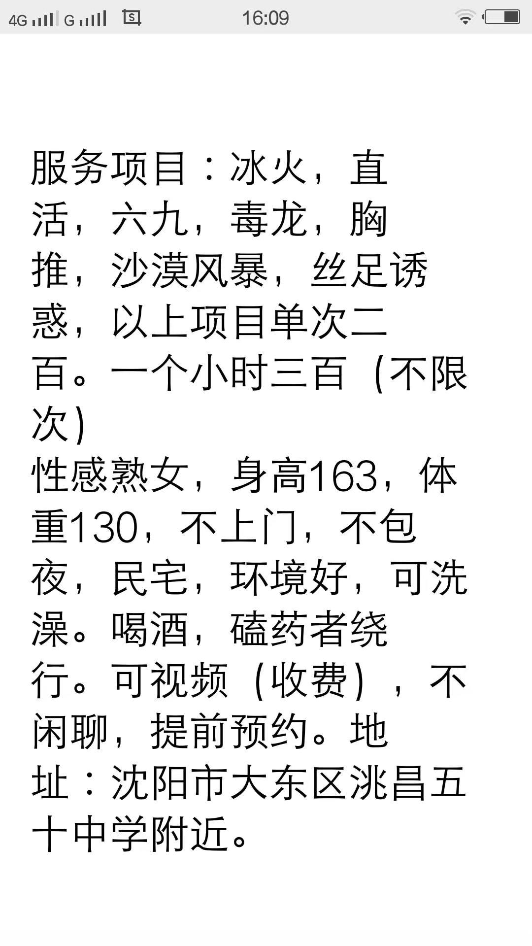 【寻欢时间】:2018年1月1日 【寻欢地点】:辽宁、沈阳(大东区五十五中学附近) 【信息来源】:狼友推荐、论坛、亲身体验 【服务项目】:沙漠风暴,胸推,69,冰火,爱爱 【妹妹数量】:1 【环境设备】:公寓 【营业时间】:全天 【价格一览】:200/次 【安全评估】:95 【服务星级】:★★★★ 【重点推荐】:胸推,冰火 【联系方式】:[unfree]2477827103(空间密码321)[/unfree] 【寻欢细节】:最近老喜欢熟女了,这个是QQ群联系的,2018的第一炮,这娘们特点就是那胸推一流可以爆出来的技术,很牛X。喜欢胸推的朋友可以去试试。在做爱的姿势感觉她比我这个小狼都懂。真是不用指挥,感觉她在干我{:2_585:},不过真的很爽很舒服。年轻控和颜值控就不要去了,喜欢成熟女性值得推荐,已经徐娘半老,自然别指望身材啥的和嫩气妹子比,肥鲍,木有异味,懂风情,,屄耐肏,毒龙尤其爽,而且也不贵,绝对适合泄火。有想玩得开爽爆了的更是不二选择 【附带照片】: