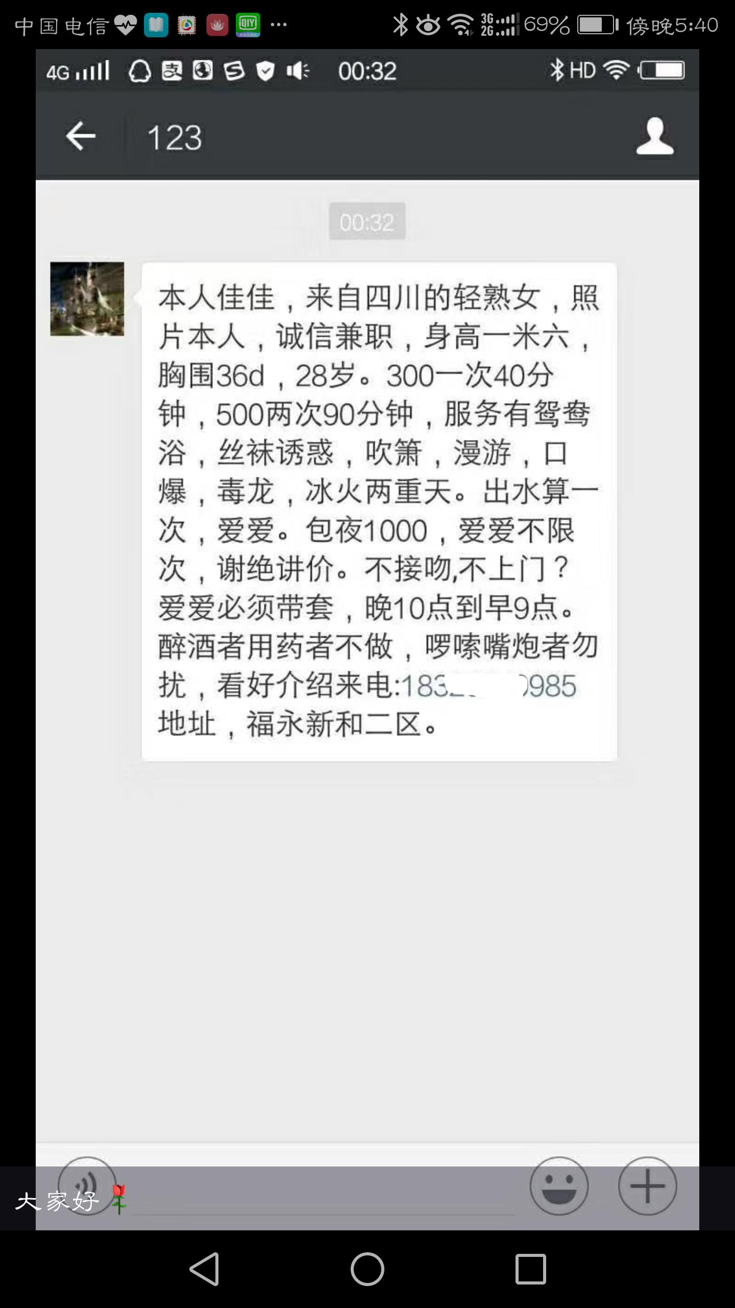 以上信息为网友分享,请在消费时自行判断谨慎消费。出现虚假信息和诈骗信息请站内短信给艾欧利雅:方法一:点击给艾欧利雅发短信——方法二:点击给艾欧利雅发短信 【寻欢时间】:2018年4月 【寻欢地点】:宝安 【信息来源】:网络 【服务项目】:很多 【妹妹数量】:没问 【环境设备】:该有都有 【营业时间】:自行联系 【价格一览】:300一次 【安全评估】:70 【服务星级】:★★★★ 【重点推荐】:豪爽,腼腆,温柔 【联系方式】:
